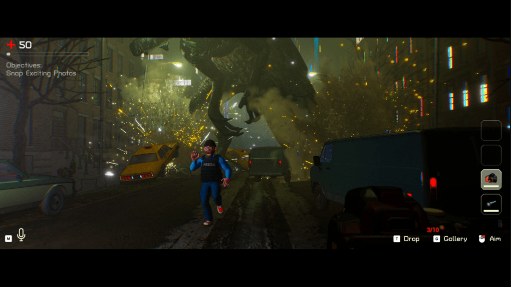 The UI/UX keeps things lean—your camera HUD dominates, with a simple overlay for press cards, health (implied, not explicit), and a mini-map for co-op coordination. It’s intuitive: aim with the mouse, snap with a click, and scroll through shots post-run. Inventory’s minimal—camera upgrades or filters might pop up (speculation based on Steam’s “spectacular footage” tease)—and navigation feels snappy.