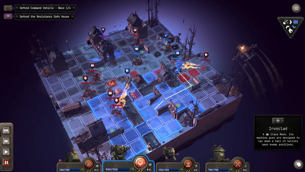 The guts of Grit and Valor – 1949 thrum with mechanics—a roguelike game beast of real-time tactics that’s pure tavern thunder. You lead a mech squad—Steam promises “Deploy your Mech Squad and command them in real time”—across shifting battlefields, each a unique gauntlet of terrain and foes. Use high ground, duck into cover, exploit weaknesses to fend off waves, all while shielding your Command Vehicle. Runs end in boss battles—Axis Generals with “kaiju-sized Boss Mechs,” hurling elite waves and hazards. Lose your Command Vehicle, and it’s game over—regroup at base, upgrade with Scrap and Valor, and redeploy. Over 100 pilot and mech upgrades twist each run—procedural enemies and rewards keep it feral.