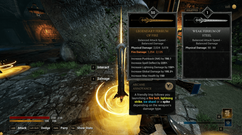 - Weapon variety & randomisation: Two-handed swords, spears, massive axes, each with different speed/damage profiles. Randomly generated stats and upgrades keep runs fresh.