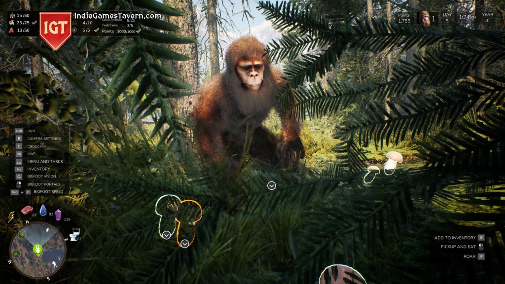- Forest Survival & Foraging: You’ll fish, catch insects, forage for mushrooms and berries, drink from lakes and streams. These are basic but essential mechanics to “live life as Bigfoot.”