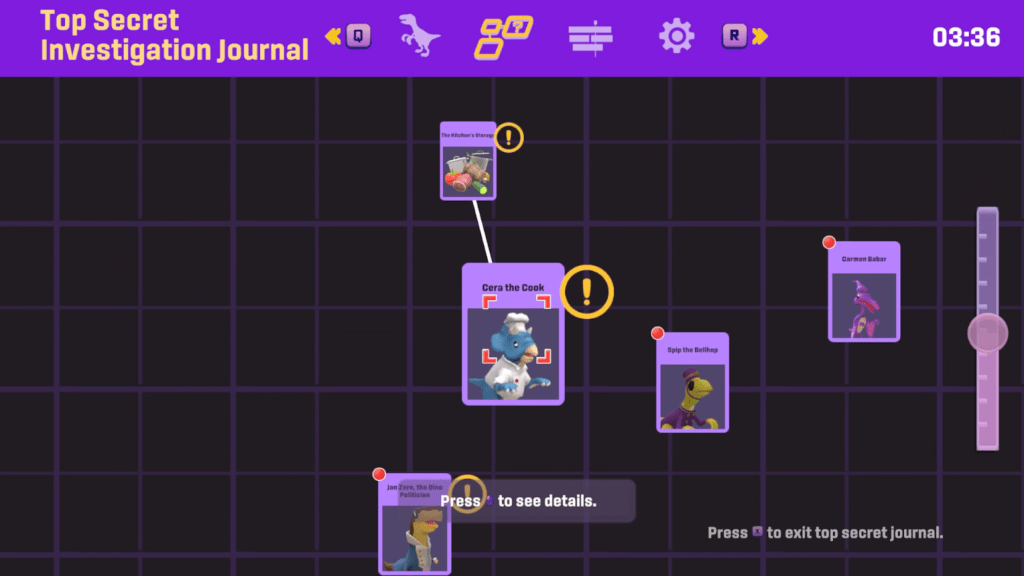 - Investigation mechanics: You’ll use tools like a magnifying glass, your literal dino nose, interrogate anthropomorphic dinosaur characters, examine evidence, follow a timetable of events, and use a node-based investigation board to track clues.