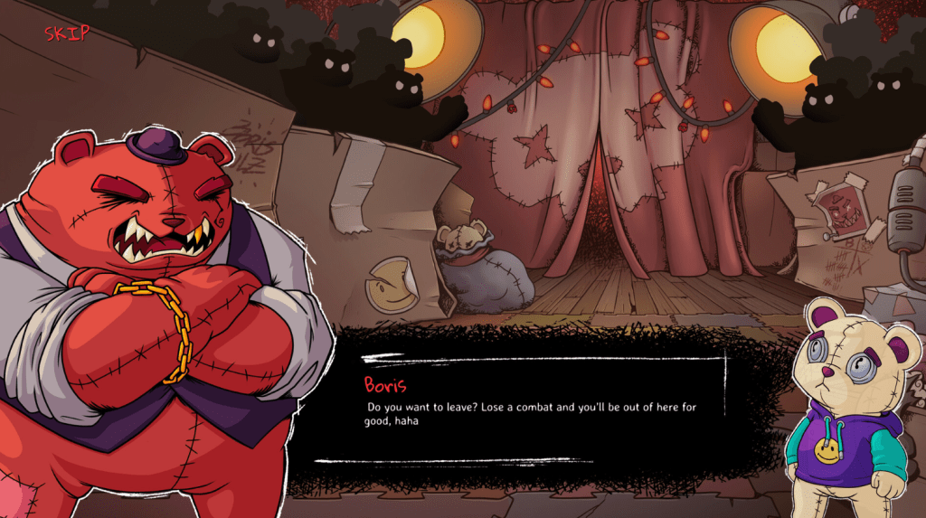 - Roguelike Deckbuilding Combat: You play as Toby, a timid teddy bear thrust into a relentless night-time tournament. Combat is turn-based, focusing on assembling powerful combos from your deck of cards — weapon cards, skill cards, consumables, and more — to defeat opponents and bosses.