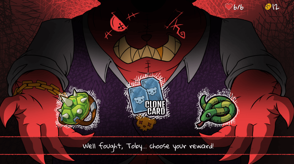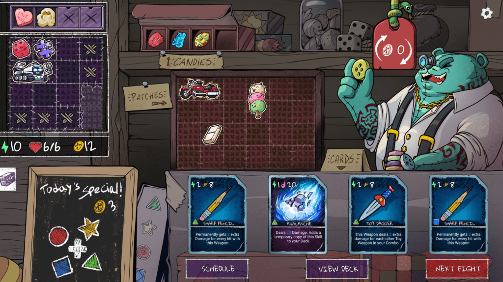 - Progression & Upgrades: As you win battles, you earn rewards and unlock new cards, patches (persistent modifiers), candies (temporary buffs), and other upgrades. Grimble, the toy shop’s enigmatic shopkeeper, lets you purchase and enhance cards, banish unwanted ones, and clone or augment your deck.